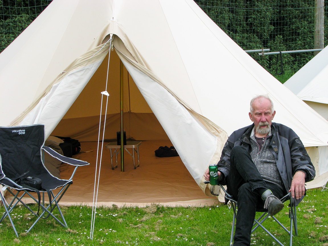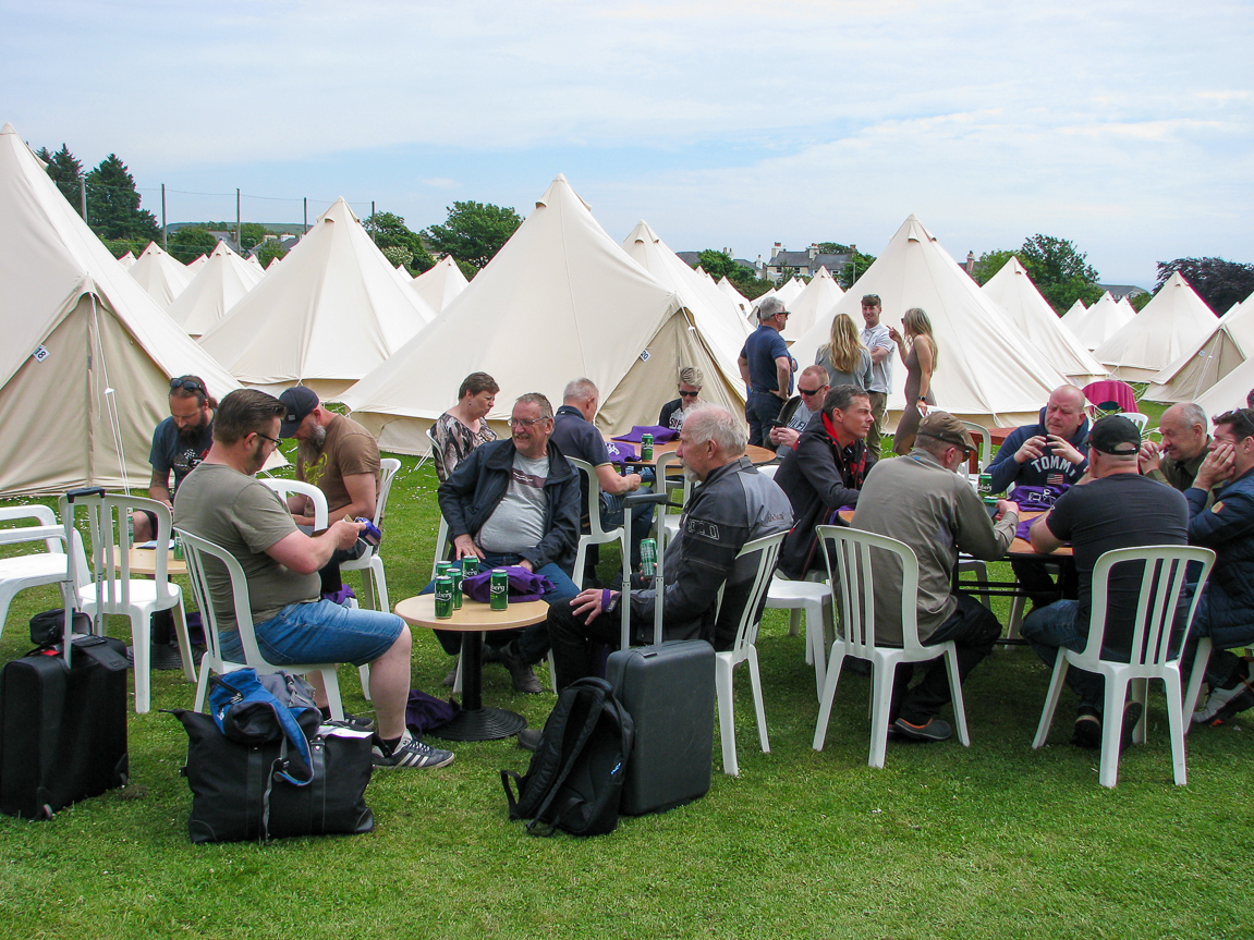 Teltlejren med stole og borde foran teltet med morgenmad.